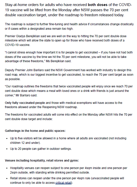 NSW GOVERNMENT ROADMAP OUT OF THE CORONAVIRUS LOCKDOWN. Roadmap allows some freedoms for fully vaccinated including visiting pubs and sport venues Gladys Berejiklian says end to some lockdown.